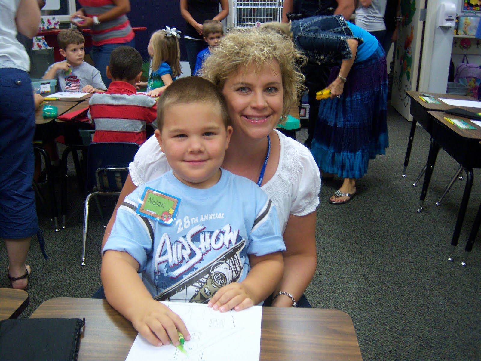 As I was leaving, I ran into a friend that I met last year in K4. Her daughter is going to 1/2 day classes. She asked me how I was doing and I told her "very well". (Little did I know at that time how I was going to feel walking out of school!!) She offered to go to Nolan's classroom to take a picture of both of us! She's so sweet~I didn't even think of that! I'm thinking she'll be a friend for life~great lady!: